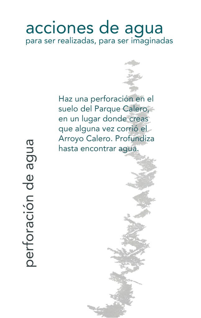 - acciones de aguas a suite of propositions for interacting with water (to be enacted, adapted and/or imagined in Quintana and La Concepción, elsewhere in Madrid, or in any watery location). The acciones de aguas are published as a set of postcards. Some of these actions were also enacted by Minty Donald, Nick Millar and Malú Cayetano, with other people, water and things in Madrid between March and November 2019.