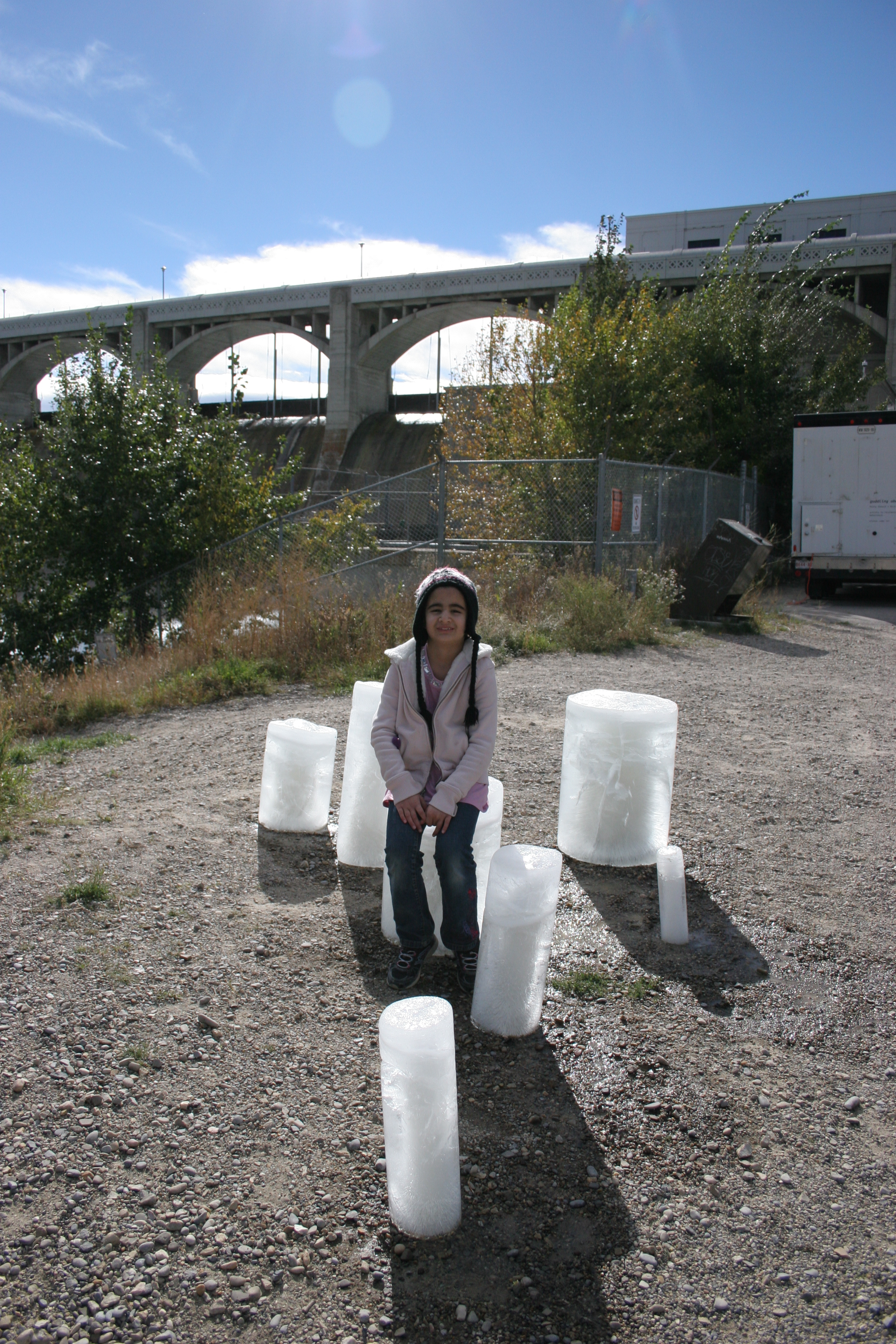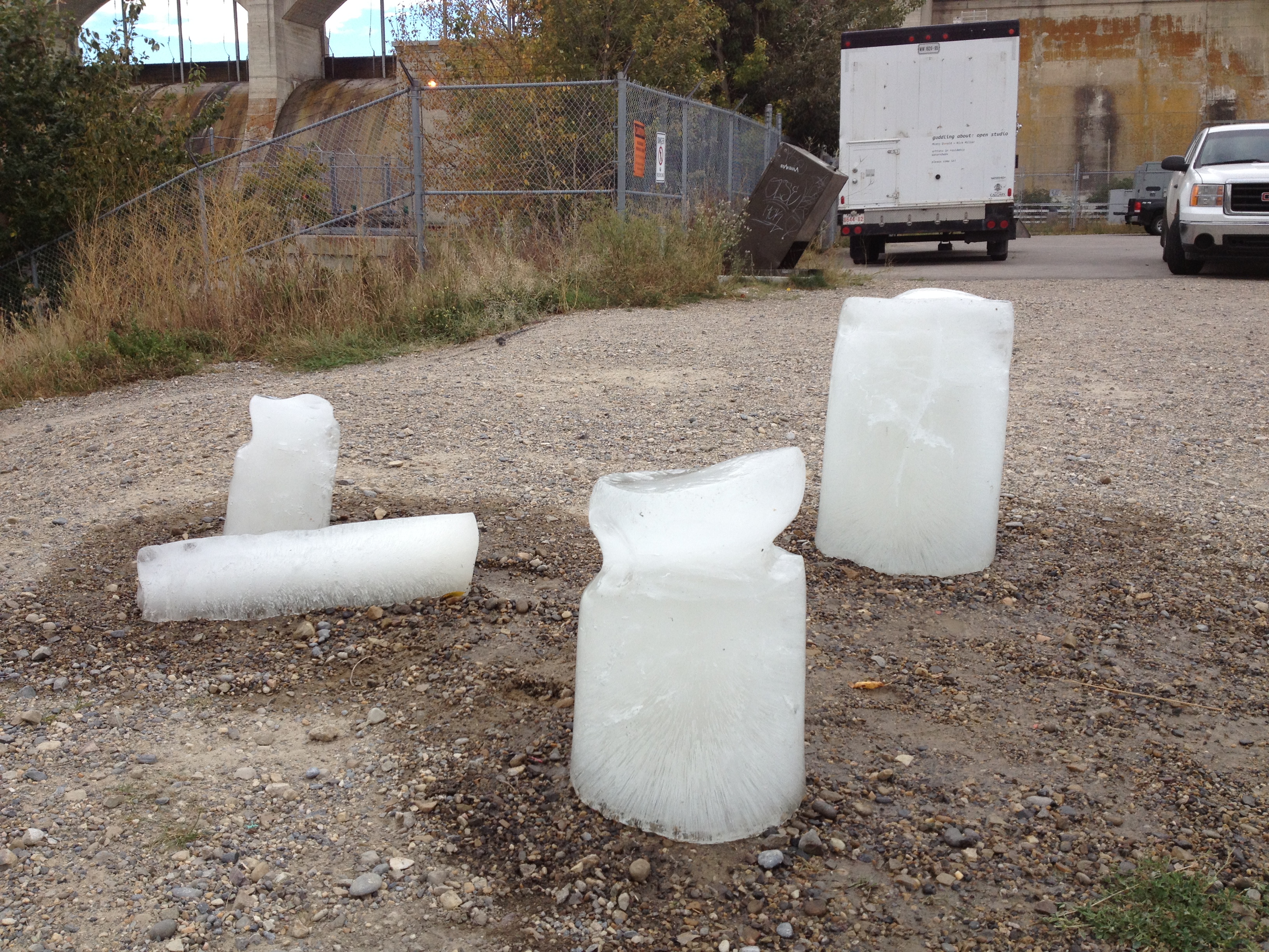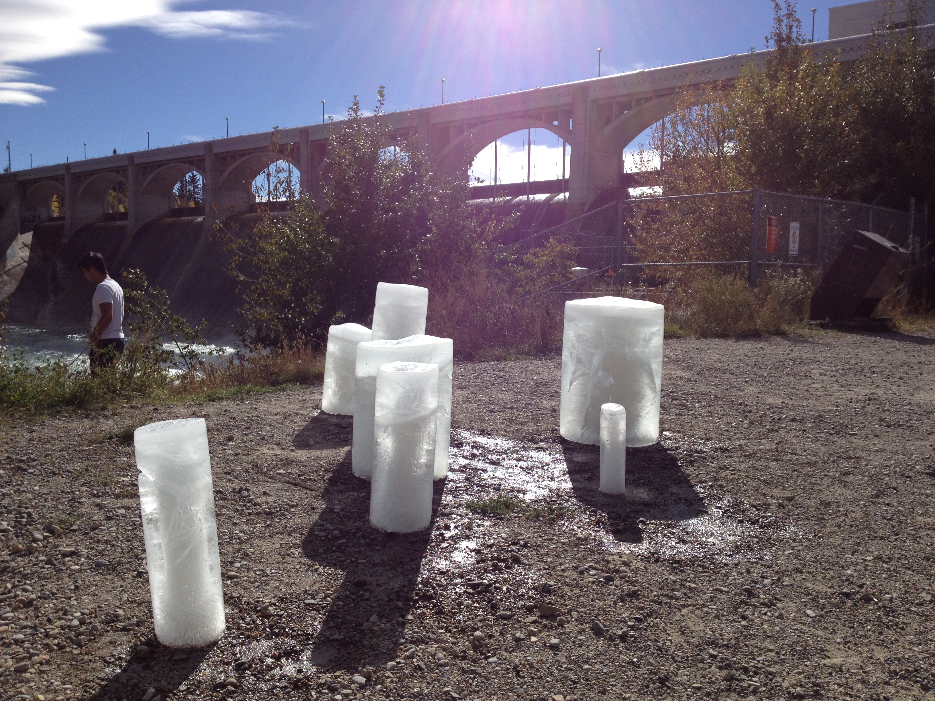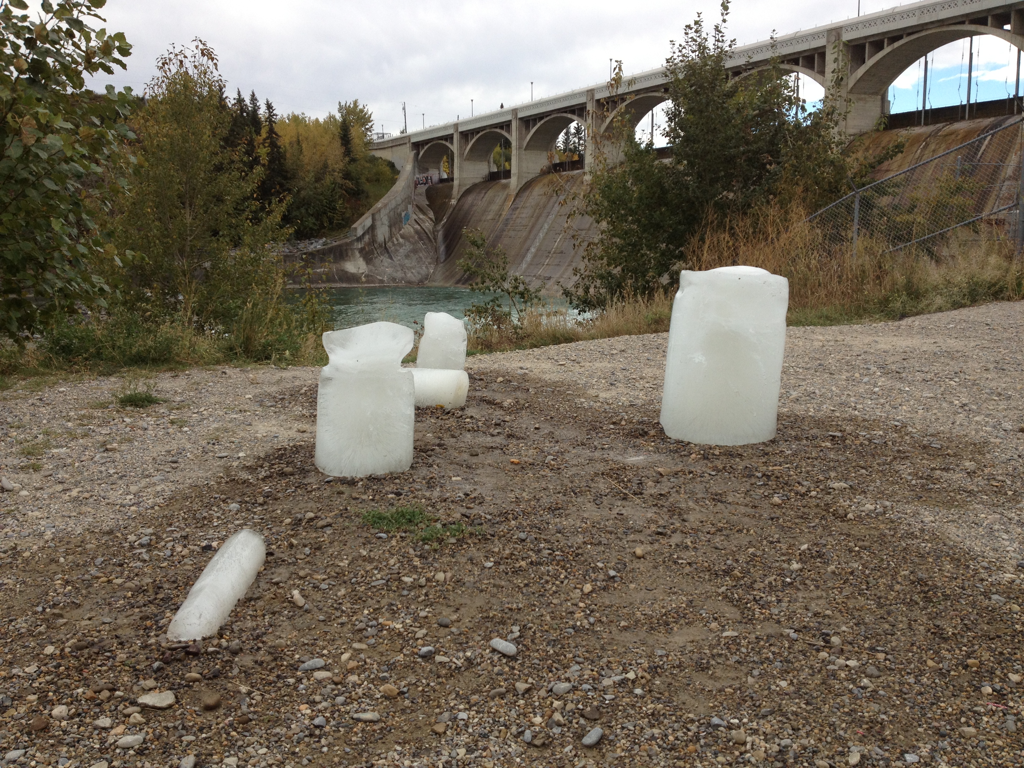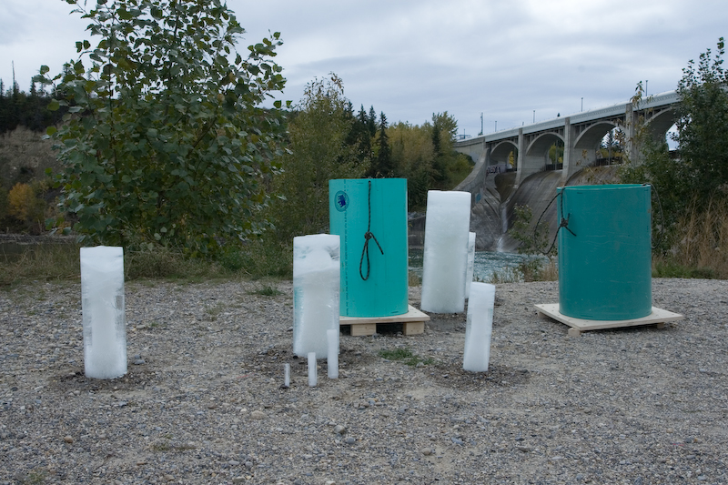 Select a number of species of animal and/or plant commonly found in the Bow River watershed. Calculate the (approximate) quantity of water present in each species. Acquire a selection of differently sized water pipes used by the City of Calgary water services department. Assign each animal/plant to an appropriately sized pipe and seal one end of the pipe to make a watertight container. Fill each pipe with a quantity of water corresponding to its assigned animal/plant and place in a freezer. The water should be borrowed from the Bow River watershed. Wait until all the water is frozen. (This might take several days for larger animals and plants, such as a grizzly bear or alpine larch.) Take the ice molds from the freezer and place them somewhere near to a body of water that will find its way to the Bow River watershed. (This might prove complicated as there are, necessarily, strict regulations about putting water or any potential contaminants into the Bow River and its tributaries. Make sure that you are confident of the source of your water and that you are certain that you are recycling unadulterated water from the Bow watershed. If any members of the public witness this experiment, please take the time to explain what you are doing, making sure that you emphasise that you returning unmodified water from the Bow River watershed to the Bow River watershed.) Carefully remove the ice columns from the molds. Observe the ice melting. Depending on how much time you have, you might like to choose a site for your Melting Species that catches the sun and to carry out the experiment in late spring, summer or early fall. This experiment could also take place in winter, but observation equipment such as a camera, set to take timed photographs, might be required.