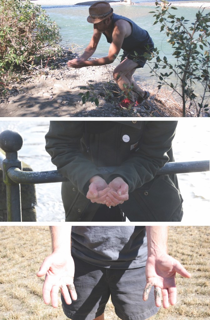 In Water Carry (Image 2) some of the paradoxes of our ecological practice are manifested. In Water Carry, and in further Guddling performances, we purport to collaborate with water, watercourses, and other nonhuman matter. The collaboration is intended to acknowledge the vitality and agency of other-than-human stuff and to compel us to become more attentive to it. In Water Carry the water can be ascribed with agency, in that the rate it trickles through our fingers partly determines the length of each performance. The water’s agency is also read in parallel performance scores that it ‘writes’: the trails of drips left on the ground in the course of each Water Carry (Image 3). Other nonhuman collaborators have agency too, influencing the form and duration of each Water Carry performance. Among those collaborators we count steep, stony riverbanks; railings; stairways; roads; and traffic, which presented obstacles and made it difficult to hold on to the water. In one instance, silt from the bed of the Bow River formed seals between our fingers, allowing us to carry water surprising distances (Image 4). However, the agency of the other-than-human in the Guddling performances is always circumscribed by our human intent. It is we who instigate the performances and we who encapsulate them, using human language, in the performance scores. This paradox is pivotal to our practice: our desire to acknowledge and embrace the agency and liveliness of our other-than-human collaborators and to challenge our anthropocentrism, while recognising the impossibility of evading our sense of ourselves as human subjects, and our enmeshment in human societal and cultural structures and systems, such as language. Engaging with this paradox — the paradox of ‘weak performance’ (Lavery 2010) — positions our work in critical dialogue with the four key ideas cited in the introduction to this essay: Bennett’s strategic anthropomorphism (2010); Haraway’s ‘staying with the trouble’, and ‘making kin’ (2016); and Barad’s ‘intra-action’ (2007). In the following section I evoke and reflect on selected Guddling performances in relation to these ideas, and to congruent arts practices.