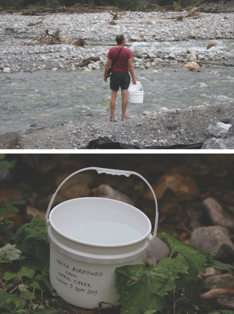 In Alberta, Canada we visited some of the tributaries that join the Bow River as it travels from its source, Bow Glacier in the Rocky Mountains, towards the City of Calgary. We greeted the rivers and creeks we visited: “hello Corral Creek, nice to meet you.” We felt a little silly and self-conscious: urban Scots alluding to what we understood to be the practices of indigenous peoples in Canada.13 But we tried to speak in a tone that felt authentic to us: playful yet sincere. We asked each creek if we could borrow some of its water. We paused and listened, aware of how attentive we were to the sounds of the water, the air temperature, the smells and textures of the rocks and trees bordering the rivers and creeks, the presence of other animate life, and the human interventions that had shaped these watercourses. After a few minutes, we stooped and scooped up some water from the creek in a bucket. We thanked the creek. Our strategic anthropomorphism here, we believe, changed our everyday relationships with rivers and other nonhuman entities, at least momentarily.14 Anthropomorphising helped us to become more attentive to the other-than-human matter, such as water, which surrounded us, and which constitutes us. It allowed us to engage seriously with the idea that stuff that is not human, like water, has vitality, force, and an agency. It urged us to consider whether rivers, water, and other nonhuman things might be seen to have rights. But anthropomorphising also revealed the inescapability of human exceptionalism. In speaking and listening to water, we treated it as if it were human: we cast it in our likeness. Our strategic anthropomorphism made manifest the paradoxes of our practice. It forced us to confront our, unavoidable, sense of ourselves as sovereign human subjects who have the power to exercise agency over nonhuman matter. Simultaneously, it functioned as a tactic that altered how we typically interact with other-than-human stuff, unsettling our taken-for-granted behaviour. We asked sincerely for permission to borrow some water and we listened attentively for a response, feeling a shift in our interrelationships with the rivers and creeks. But our requests for permission to borrow water were uttered in the belief that the question is meaningless to a river and in the knowledge that, even if it did ‘reply,’ we would neither understand, nor heed, its response (Image 5).15