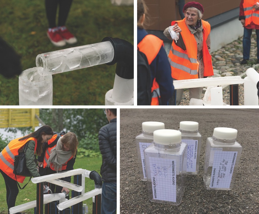 For the performance, Watermeets: Kuopio, audience-participants joined us on a tour of the local waste water treatment plant, called Lehtoniemi. (Image 6). The plant sits on the shore of Kallavesi, a large fresh water lake surrounding the City of Kuopio, which is a popular tourist attraction, and which plays a significant role in shaping the identity and way of life in Kuopio. Kallavesi is a source of drinking water in the area, and is also the destination of treated waste water from the Lehtoniemi plant. Watermeets: Kuopio invited audience-participants to confront water in forms less spectacular and considerably less attractive than the celebrated lake where many of them regularly swim, fish, and boat. It invited them to witness the often overlooked processes and systems governing the circulation and management of water in the area, and to contemplate the infrastructure through which water is treated, tested, categorised, and segregated according to human measures of purity. At the end of the performance, audience-participants gathered around a structure of interconnecting pipes, gutters, and bowls cast in frozen water borrowed from Lake Kallavesi, and from the local fresh water treatment plant, Itkoniemmi (Image 7). Audience-participants were asked to bring with them a bottle of borrowed water from their everyday routines, or from somewhere watery that held significance for them.16 To conclude the performance we invited audience members to pour the water from their bottles into the structure, letting it interact with the ice pipes, bowls, and gutters. Some of the meetings between water and ice were surprising and dramatic, the ice shattering with sharp cracks and groans. Petri Juntunen, a water engineer in the Lehtoniemi sewage treatment plant, orchestrated a meeting of fluids that he described as ‘his worst nightmare.’ He poured a sample of water from the outflow of the waste water treatment plant into an ice gutter moulded in water from the fresh water treatment plant, allowing treated waste water to intermingle with frozen, fresh drinking water. In doing so, he transgressed the central tenet of his professional role: to provide uncontaminated potable water for Kuopio. Petri’s ludically-transgressive action, enabled by his interaction with our playful, fragile, and ephemeral system of interconnecting water pipes and vessels seemed, to us, to hint at the vulnerability and impermanence of the apparently substantial and functional infrastructure of Kuopio’s waste water treatment plant. For us, it pointed to the precarity of systems designed to manage water and other environmental resources in support of human life, and to their irrelevance in relation to Earth systems, such as the play of water itself. Petri’s action is considered by us a tactic for ‘staying with the trouble’ (Haraway 2016). It revealed the complexity and consequences of the processes, negotiations, and choices determining human-water interrelations in the area, alongside further encounters among humans, water, and other things that we instigated as part of Watermeets: Kuopio. These encounters occurred on modest scales and at personal levels. Any transgressions, such as Petri’s, or confrontations, such as the audiences’ exposure to the sights and smells of the waste treatment plant, were mischievous or unpleasant, rather than illegal or dangerous. Here, ‘staying with the trouble’ did not entail confronting global, water-related environmental issues directly. Rather, it worked with audience-participants, most of whom were local to Kuopio and therefore very familiar with the ‘natural’ and dominant waterscape of this region of Finland. They were invited to attend to the water that permeates their everyday routines through playful, somatic, and affective interactions. They were prompted to consider the often over-looked systems and structures through which water is managed, and the implications of regulating and categorising water in this way. In its local, indirect, and unheroic address to environmental issues, and its foregrounding of other-than-human performers, Watermeets: Kuopio can also be considered as ‘weak’ performance (Lavery 2010).