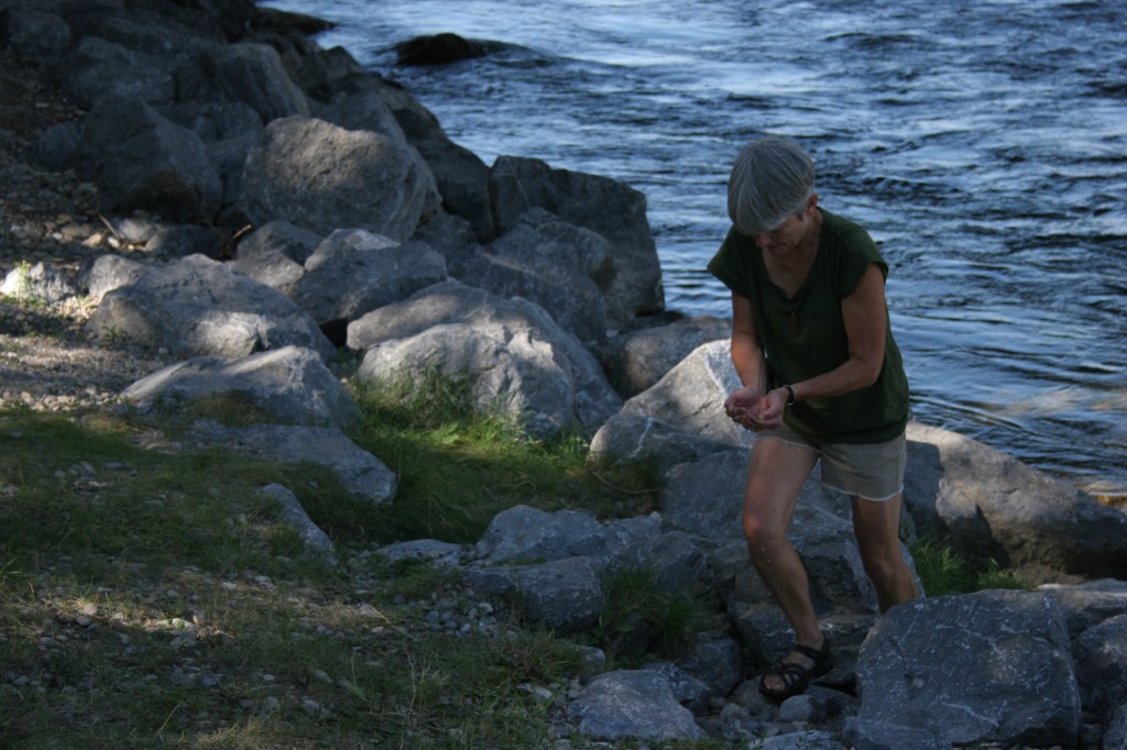 I crouch and hold the bucket in the water. The strong current tugs at the white plastic container and its metal handle digs into my flesh. I feel the force of the water. I lift the part-full bucket from the stream. I thank the creek — as if it cares.