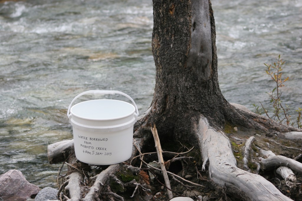 I stand with my legs braced to balance on the slippery banks of Mosquito Creek in the Canadian Rocky Mountains, an empty white plastic bucket in my hand. I am here, impelled by the performance score I wrote: the instructions for Water Borrow. My task,‘ask the tributary for permission to borrow some water’ is clear and not difficult to enact. But I hesitate. How should I frame the question? How do you address a creek? I feel a little foolish and self-conscious, aware of the absurdity of ascribing agency to a river and uncertain about the proto-animist stance I am about to adopt. I am conscious that I am a white, Scottish woman anticipating an action that might be seen as co-opting indigenous practices and beliefs regarding waters. I speak. ‘Hello Mosquito Creek’, I say, in a tone that I hope sounds ‘genuine’: friendly, light-hearted and perhaps a little hesitant. ‘Nice to meet you. Please can I borrow some of your water?’ I wait. I listen to the water rushing and gurgling over the creek bed. I listen intently and become attuned to a constant quality in the sound of the creek but also to variations in the tone, pitch and timbre of the water running over different surfaces. I listen to the ‘voice’ of the river. In listening, I have a sense of a temporality that far exceeds human timescales and comprehension. If I could wait long enough, would I ‘understand’ the voice of the creek? Would my relationship with the river evolve? I feel conscious of my insignificance and a sense of the unknowability of the more-than-human universe. I wait and listen some more. How long before I decide if permission for me to borrow water has been granted? Does the water have any ‘say’ in my decision?