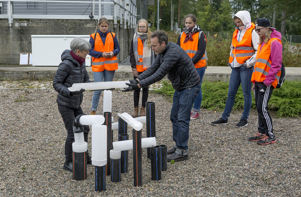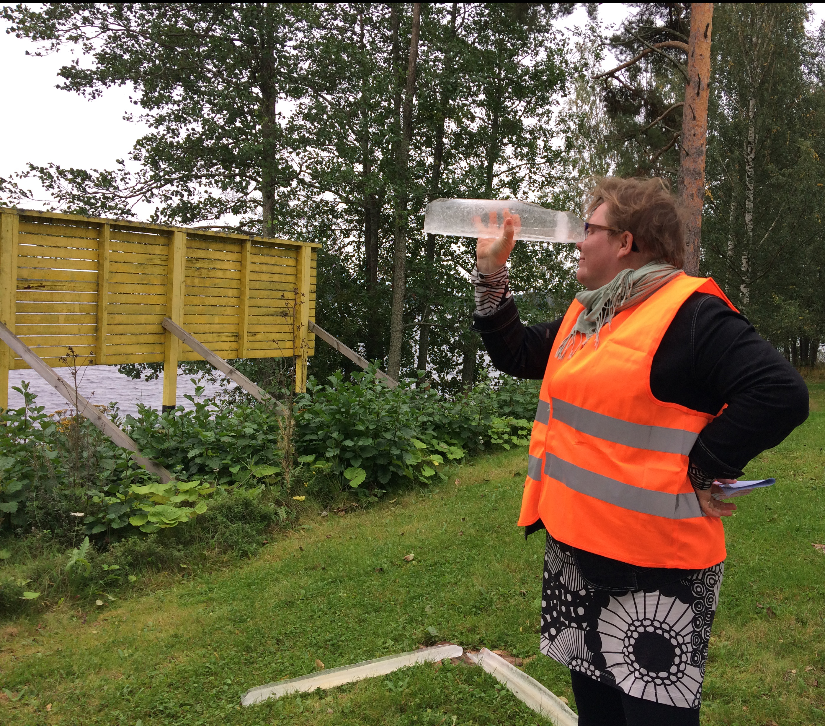 Watermeets: Kuopio was a participatory performance, performed six times over two days, to a capacity audience of ninety. When booking to take part, audience members were invited to bring with them a sample of water from their everyday lives, which would be used in the performance. Audience-participants met Minty Donald and Nick Millar in Kuopio town centre. After a short introduction, they travelled with the artists by minibus to either the local fresh water or waste water treatment plant. In the participatory performance, audience members learned about and engaged in the meetings of different waters: waters within the ‘natural’ waterscape of Kuopio and the ‘built’ infrastructure through which water is managed by local water company Kuopion Vesi. Six employees oflocal water management company, Kuopion Vesi, participated in Watermeets: Kuopio as guides.